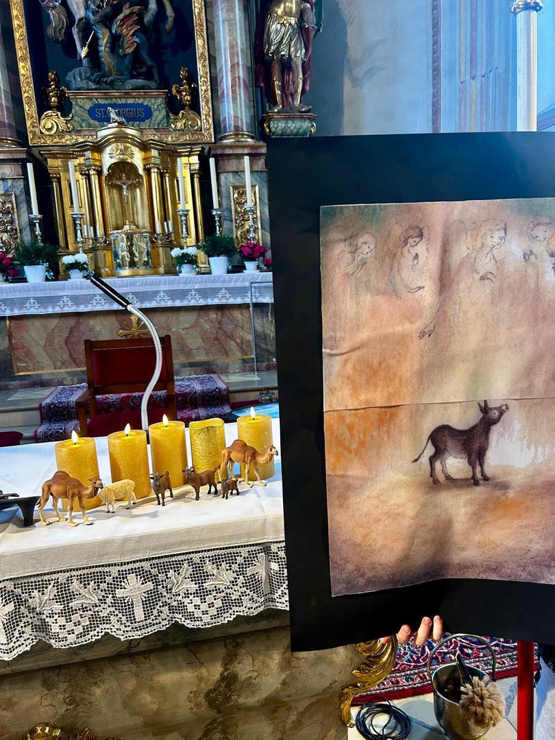 Im Mittelpunkt des Gottesdienstes stand die Geschichte „Ein Esel geht nach Betlehem“. Aus der Perspektive des Esels wurde der Weg nach Betlehem erzählt – ein Weg, der nicht immer leicht war, aber von